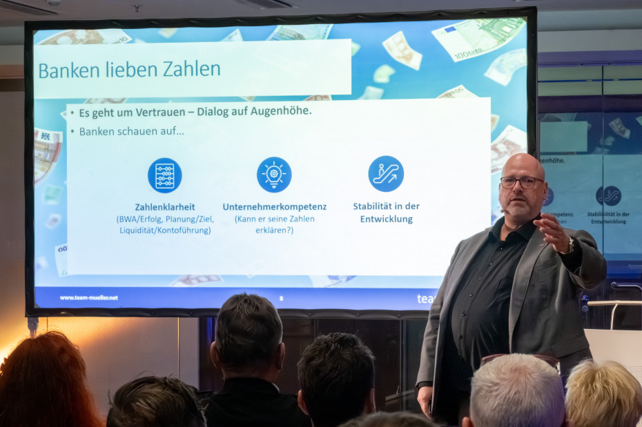 Finanzierung und Fördermöglichkeiten sind wichtige Bausteine in der wirtschaftlichen Entwicklung. Ebenso wichtig ist es aber, die eigenen Kennzahlen im Blick zu behalten, um als Unternehmer sicher "navigieren" zu können. Passend zur Location unseres Gastgebers der Volksbank Kassel Göttigen drehte sich an diesem Abend folglich alles um das Thema Finanzierung und Banken.