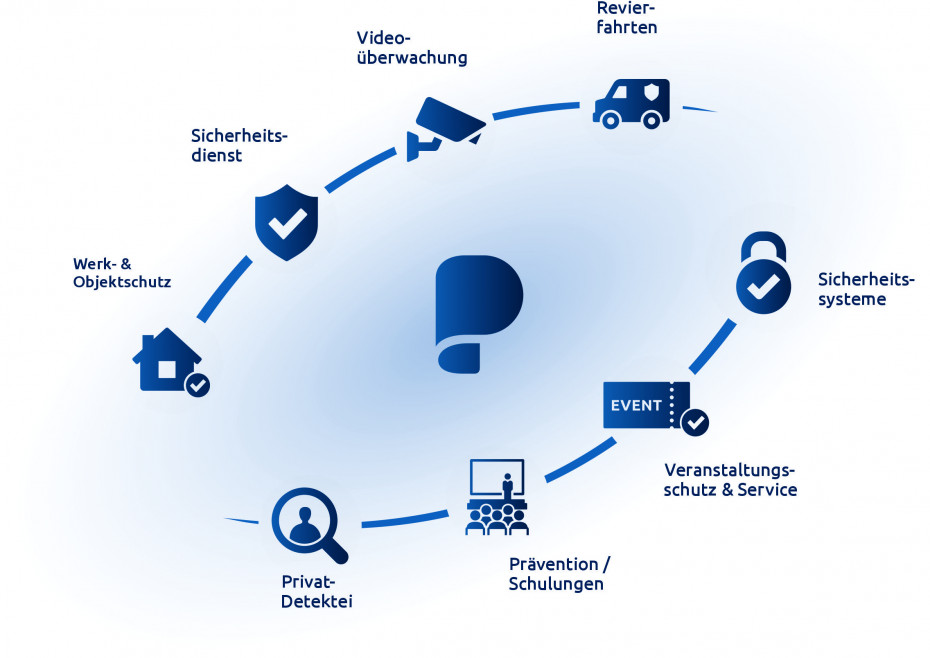 - Personelle und technische Bewachung von Menschen, Gebäuden und Werten im Rahmen des Werk- und Objektschutzes (auch in Form von Pförtnerdiensten)