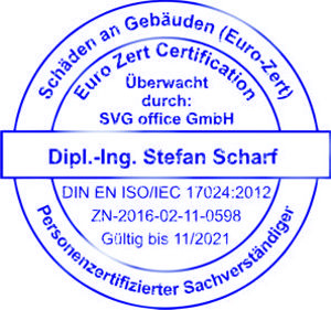 Die Berufsbezeichnung Bausachverständiger und Gutachter wird in Deutschland synonym benutzt. Sie setzt einen Nachweis der besonderen Fachkunde voraus. Ich bin ausgebildeter Dipl.-Ing. im Bauwesen, verfüge über eine jahrzehntelange Erfahrung bei Bau/Umbau sowie Sanierung/Modernisierung und wurde in 2016 von der SVG Office GmbH als Bausachverständiger/Gutachter und personenzertifizierter Sachverständiger für Schäden an Gebäuden gemäß DIN EN ISO / IEC 17024:2012, (SVG office GmbH, Euro-Zert) ZN-2016-02-11-0599 zertifiziert.